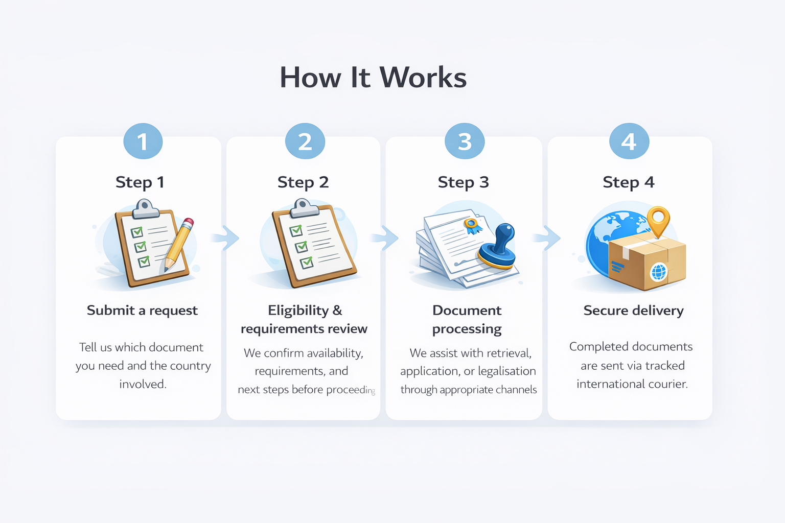 Birth, death, and marriage certificates, police clearances, apostilles, and legalisation — professionally handled for clients abroad.